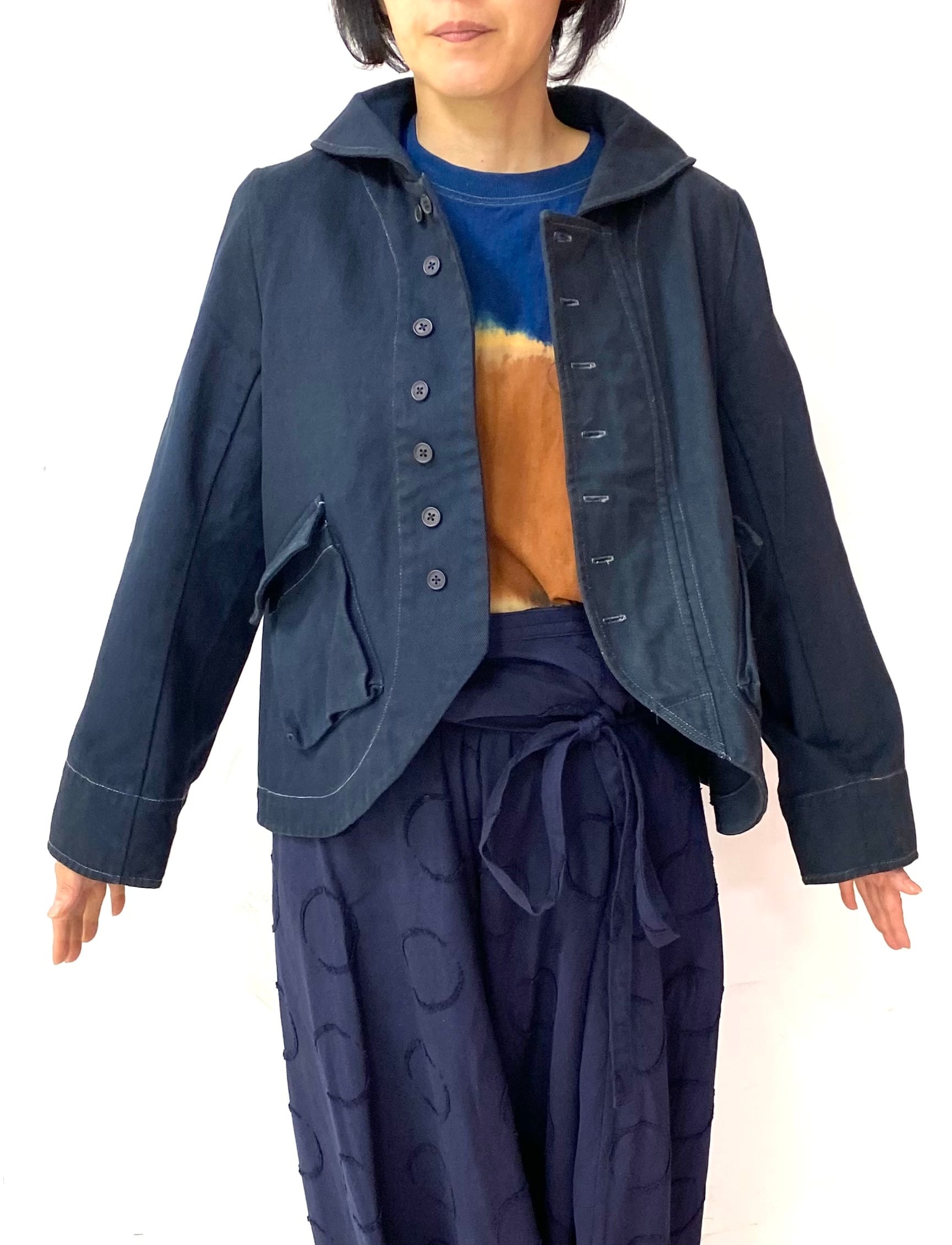 **denim Short.jacket**は、奄美の美しい自然からインスパイアされて生まれた一枚です。奄美泥染めと藍染の重ね染めによって生み出された独特な色合いが、他にはない魅力を放ちます。ショート丈のデザインは、可愛らしさを引き立て、カジュアルなコーディネートにもぴったりです。